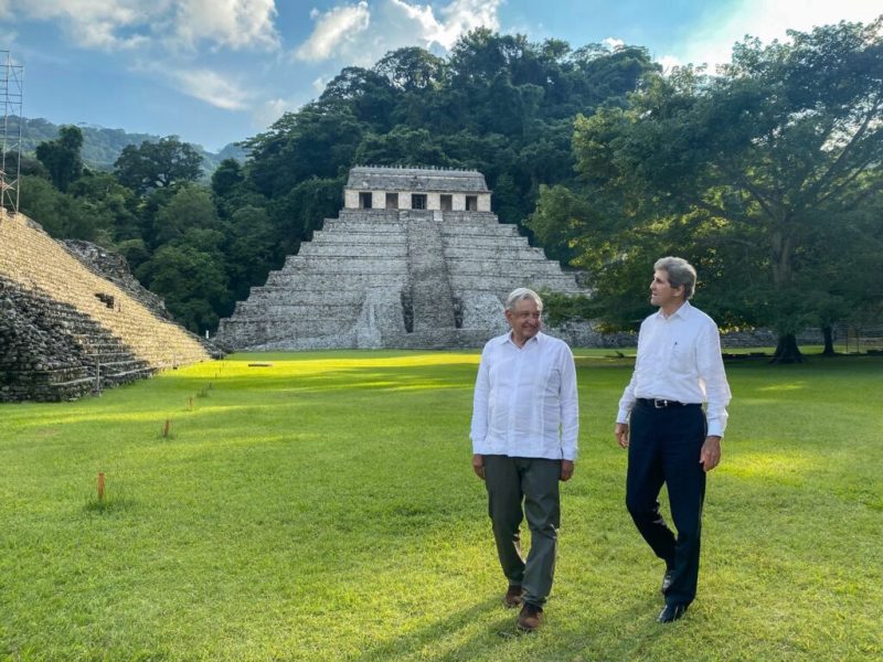 El presidente Andrés Manuel López Obrador recorrió la zona arqueológica de Palenque, Chiapas, acompañado de John Kerry, enviado especial para el clima del gobierno de los Estados Unidos. AMLO y Kerry trataron temas relacionados a las energías limpias.