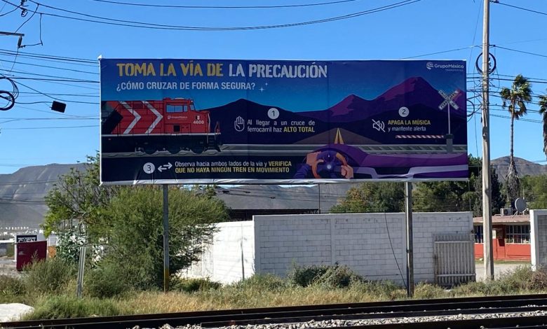 El espectacular, colocado por Grupo México, proporciona información a los conductores sobre cómo cruzar de manera segura las vías para evitar un accidente con el tren.