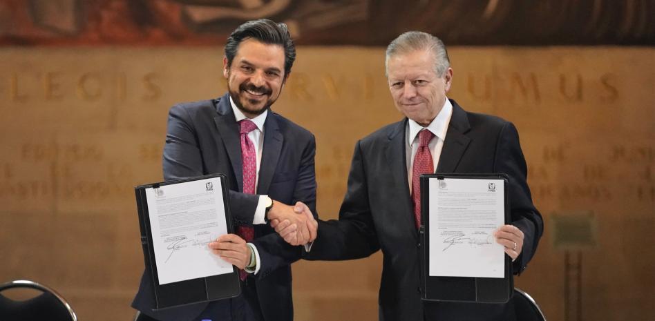 El Ministro Arturo Zaldívar, Presidente de la Suprema Corte de Justicia de la Nación (SCJN) y del Consejo de la Judicatura Federal (CJF), y el director general del Instituto Mexicano del Seguro Social (IMSS), Zoé Robledo, firmaron este miércoles un convenio histórico de colaboración por la justicia, la salud y la seguridad social, en beneficio de todas las personas del país.
